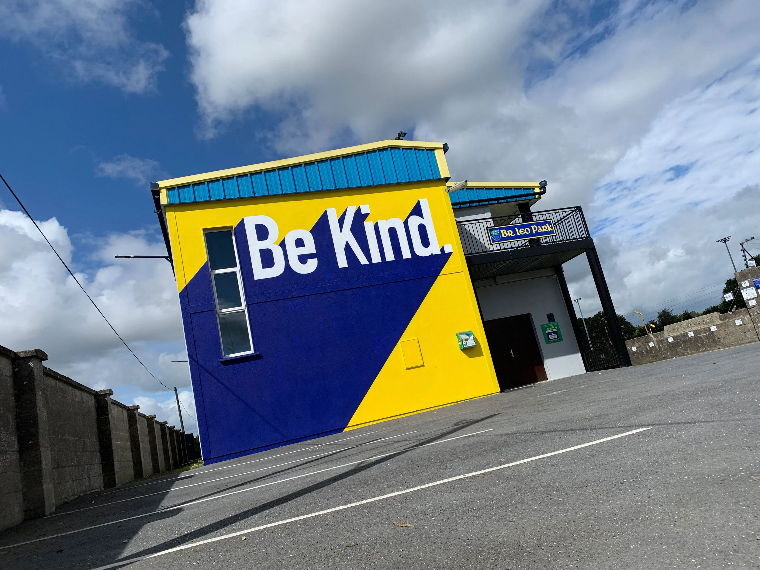 “Be Kind” is a typographic mural by Paul Byrne, created for St. Patrick’s GAA Club in Tullow as a public prompt to encourage conversation around mental health. Designed and painted by Byrne, the work uses a simple, direct message positioned within a highly visible community setting, where members of all ages regularly gather. By embedding the piece within a familiar and trusted environment, the mural introduces a gentle but consistent reminder of the importance of empathy, awareness and open dialogue.