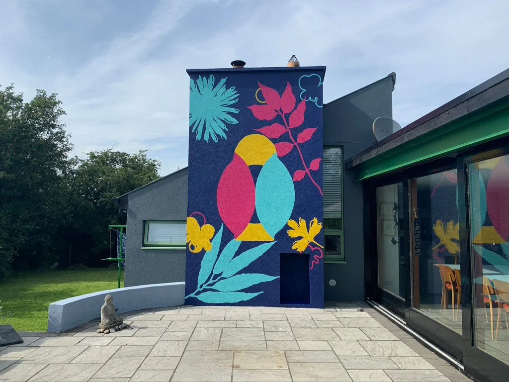 “Arthur’s Wall” is a site-specific augmented reality mural by Paul Byrne, created for a private client on a large exterior wall overlooking a social gathering space. The work is based on one of Byrne’s “Doll” designs, reinterpreted in response to the client’s environment and way of living. The mural presents a central figure which, when activated through AR, opens to reveal plant life drawn from the surrounding garden, creating a direct connection between the artwork and its immediate context.
