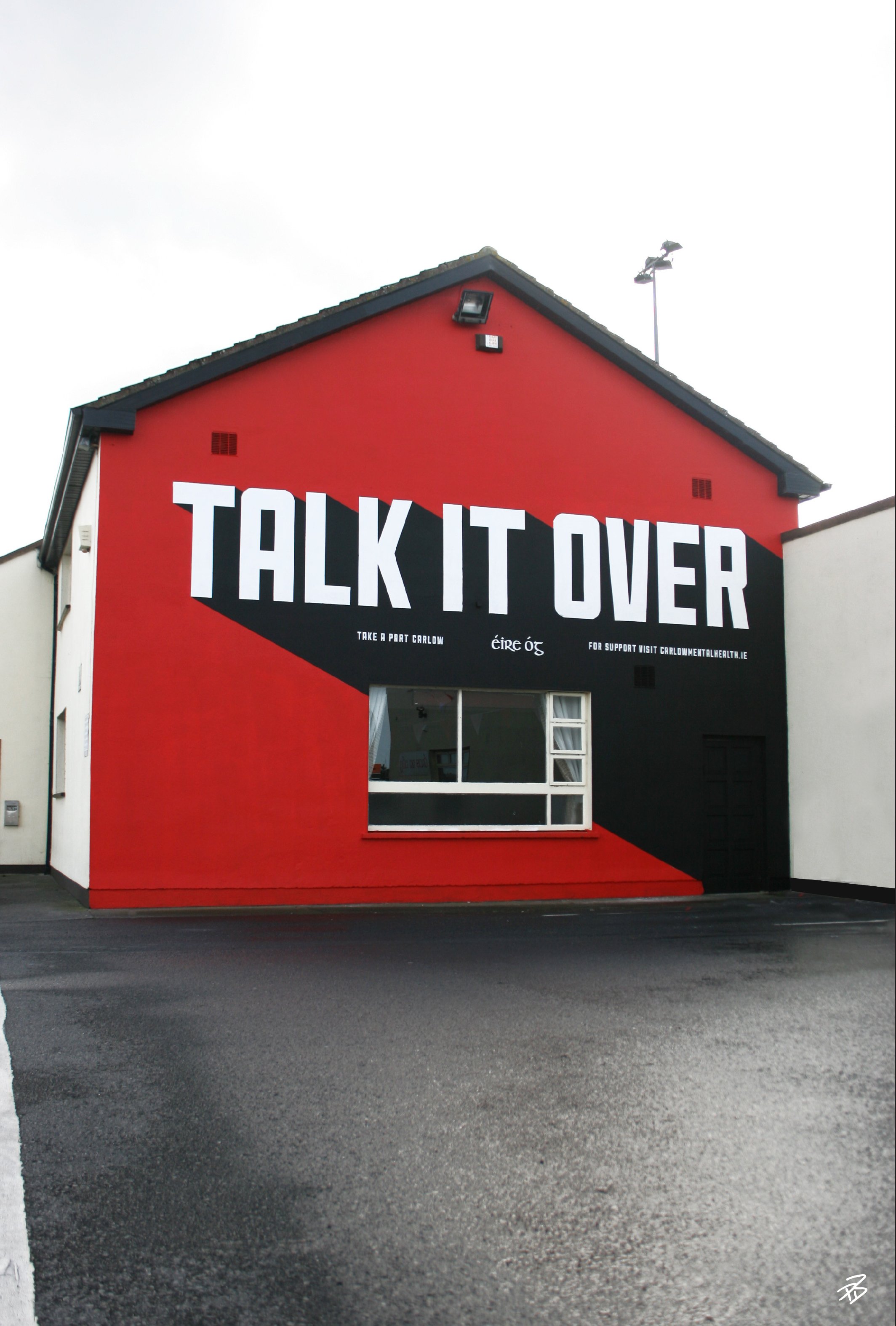 “Let’s Talk” is a street art project by Paul Byrne, created as part of the Carlow Mental Health Association’s Mensana Festival in 2018. Installed across two prominent locations at Éire Óg Clubhouse and Miller’s Pub, the typographic works were designed to act as simple but direct public prompts, encouraging open conversation around mental health. Positioned within everyday social spaces, the pieces aimed to meet people where they are, embedding an important message within the natural flow of daily life.