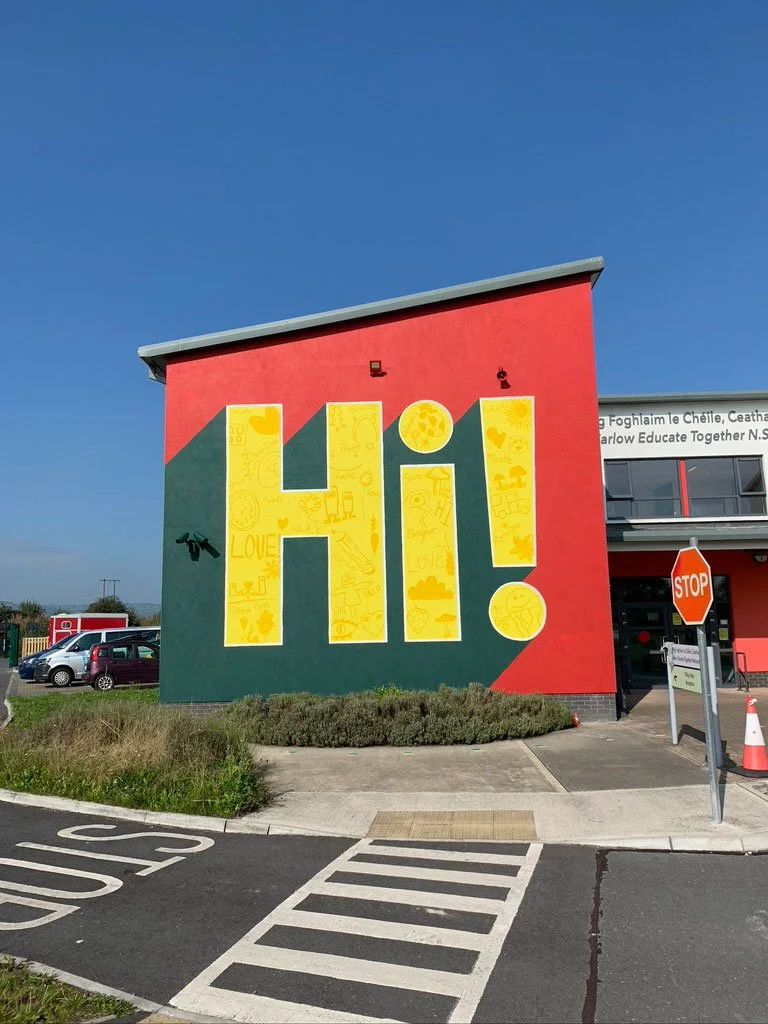This mural project was developed by Paul Byrne in collaboration with a 6th class group from Educate Together National School in Carlow, supported through an Arts Act Grant from Carlow Arts Office. The project centred on an exploration of cultural identity, belonging and inclusion, inviting students to reflect on their own backgrounds while recognising and celebrating the diversity within their school community. Through a series of facilitated workshops, participants shared personal stories, languages and experiences, which informed the concept and design of the final artwork.